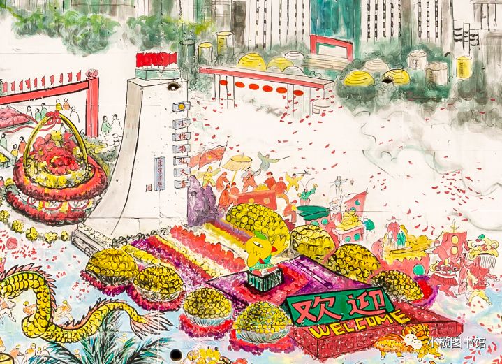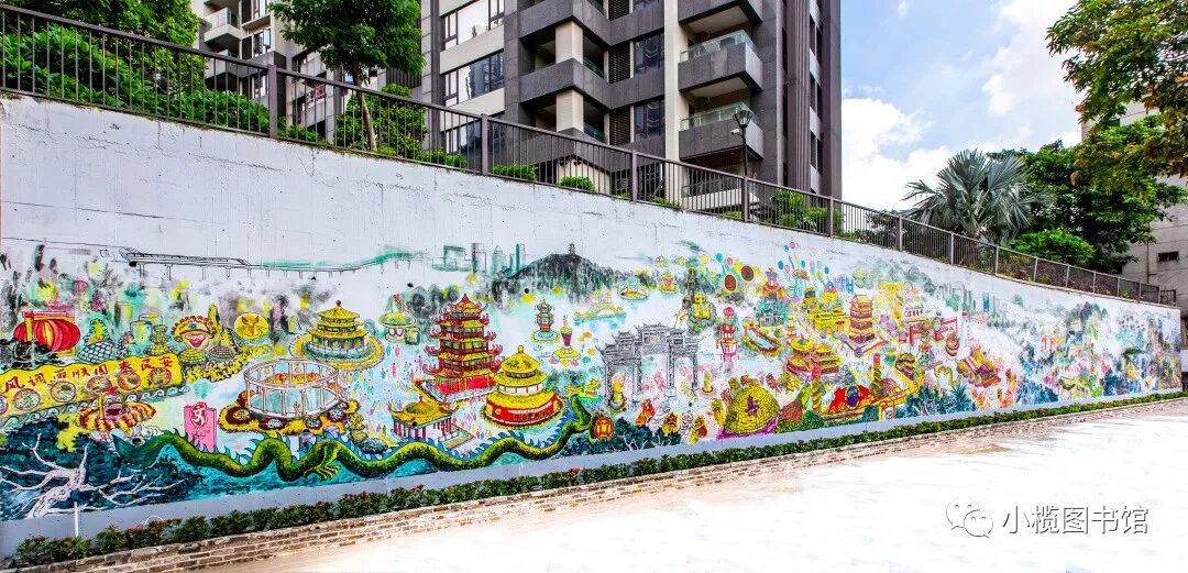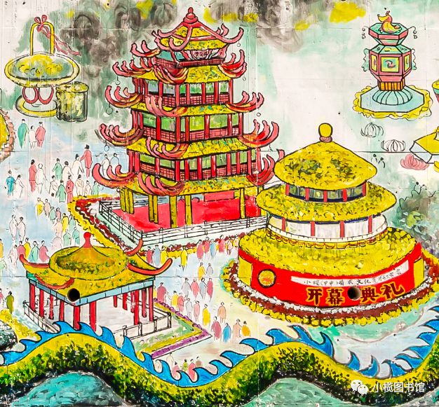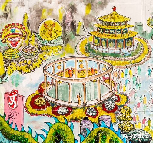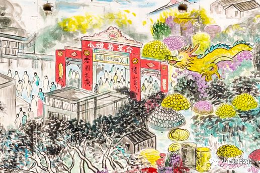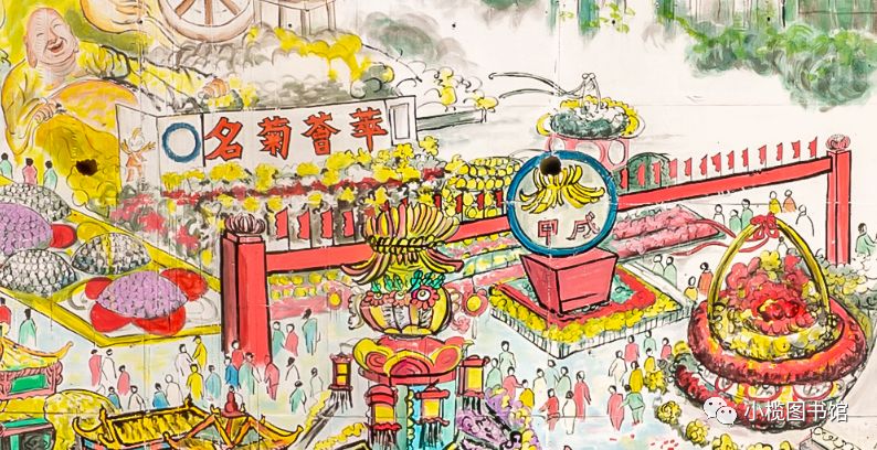 小榄菊花文化墙绘 位于小榄镇新时代文明实践中心内的小榄菊花文化墙绘,长46米,高5米,由小榄镇美术协会联合社会机构共同完成。墙绘以小榄1934年至2018年间举办的大型菊会盛况为背景,在展现小榄菊花会规模宏大、色彩斑斓、技艺精湛的同时,也反映了小榄社会经济发展和人民生活的变化。历年菊花会景象一一进入画卷,集中呈现历届菊花会最具特色的菊艺造型,再现小榄菊花会盛况,让人们徜徉于小榄菊花会历史长河中。