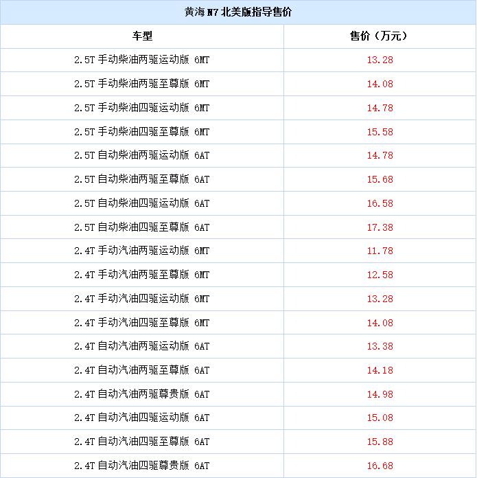 同时,黄海N7北美版共推出汽油/柴油、两/四驱共18款车型,其指导价区间为13.28万元-17.38万元,可以说极具竞争力。