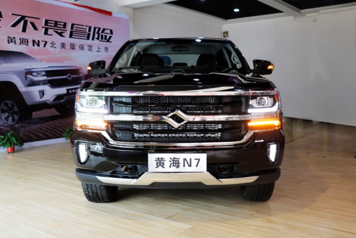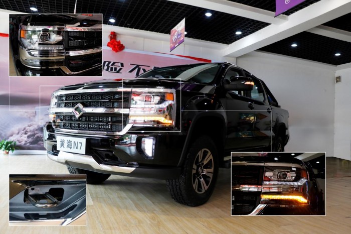 详细来看,黄海N7北美版选用了LED日间行车灯,前大灯装备一体式LED光源,内部部分熏黑处理,灯具选用分层式规划,雾灯则选用多点式LED光源,凸显高端大气。中网全体贯穿式规划与前大灯相连,再加上选用镀铬处理的边框,一股霸气、时髦感情不自禁;前脸中部上下装修条则选用钢琴烤漆原理处理,凸显出高端皮卡所具有的的层次感与厚重感。
