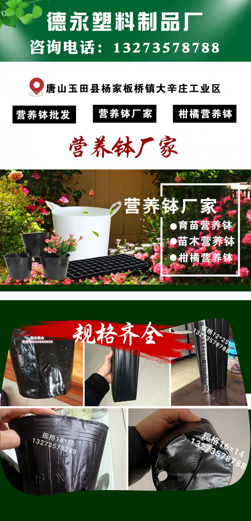 玉田县杨家板桥镇德永塑料制品厂,华北地区早经营营养钵,位于规模大的营养钵生产基地-玉田县,地处京津唐金三角中心腹地;京秦铁路,京沈高速,102国道擦厂而过,交通便利,信息畅通。一年四季销售批发各种规格营养钵、穴盘、遮阳网、蜂窝育苗袋、嫁接夹,滴灌管等产品。产品主要服务于花卉类、苗木类、蔬菜类育苗。